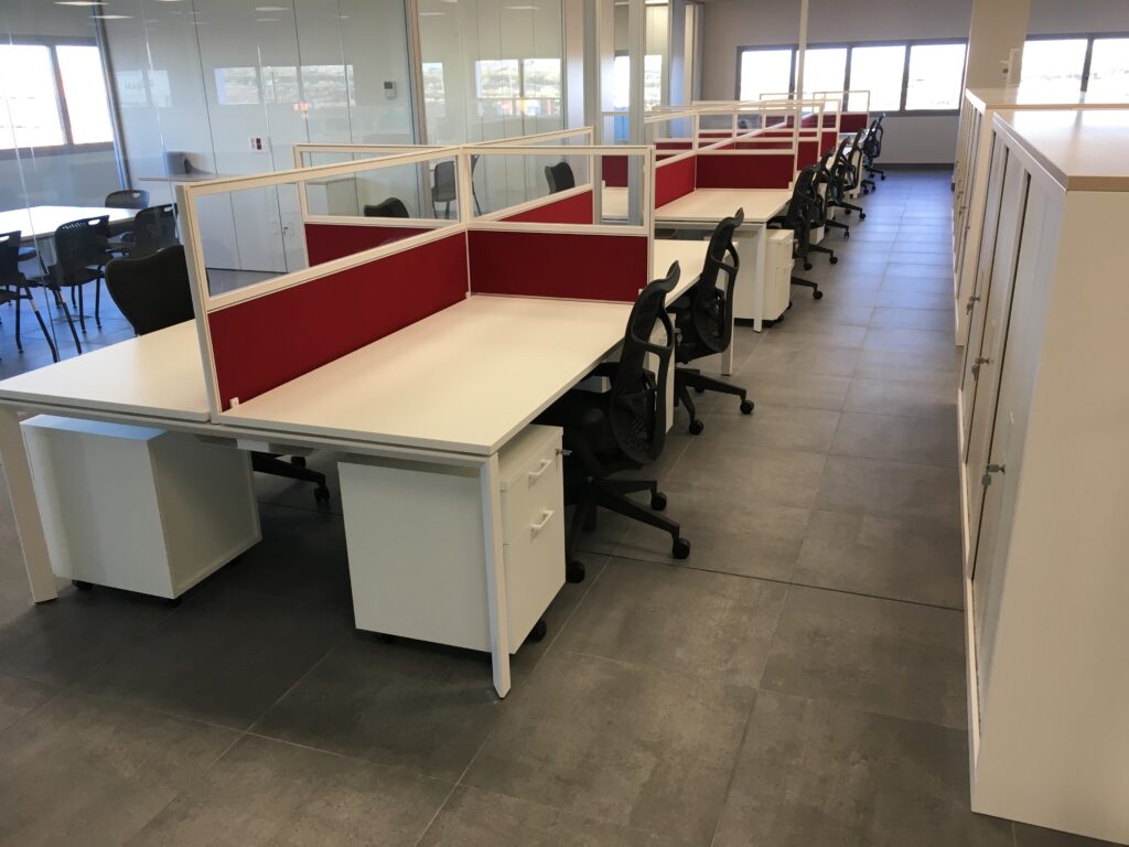 La duda y el reto, siempre con los open space, es saber cómo minimizar el sonido de más de 60 personas en una misma oficina. Y ello lo conseguimos con elementos fonoabsorbentes como los paneles acústicos con tapizado PET y sus pantallas de metacrilato transparente que permiten a su vez el paso de luz y una mayor comunicación visual a la vez que separa ambientes y sonidos, y techos acústicos. Todo ello absorbe las verberaciones de la voz y el sonido evitando ecos y zumbidos tan molestos en zonas comunes.